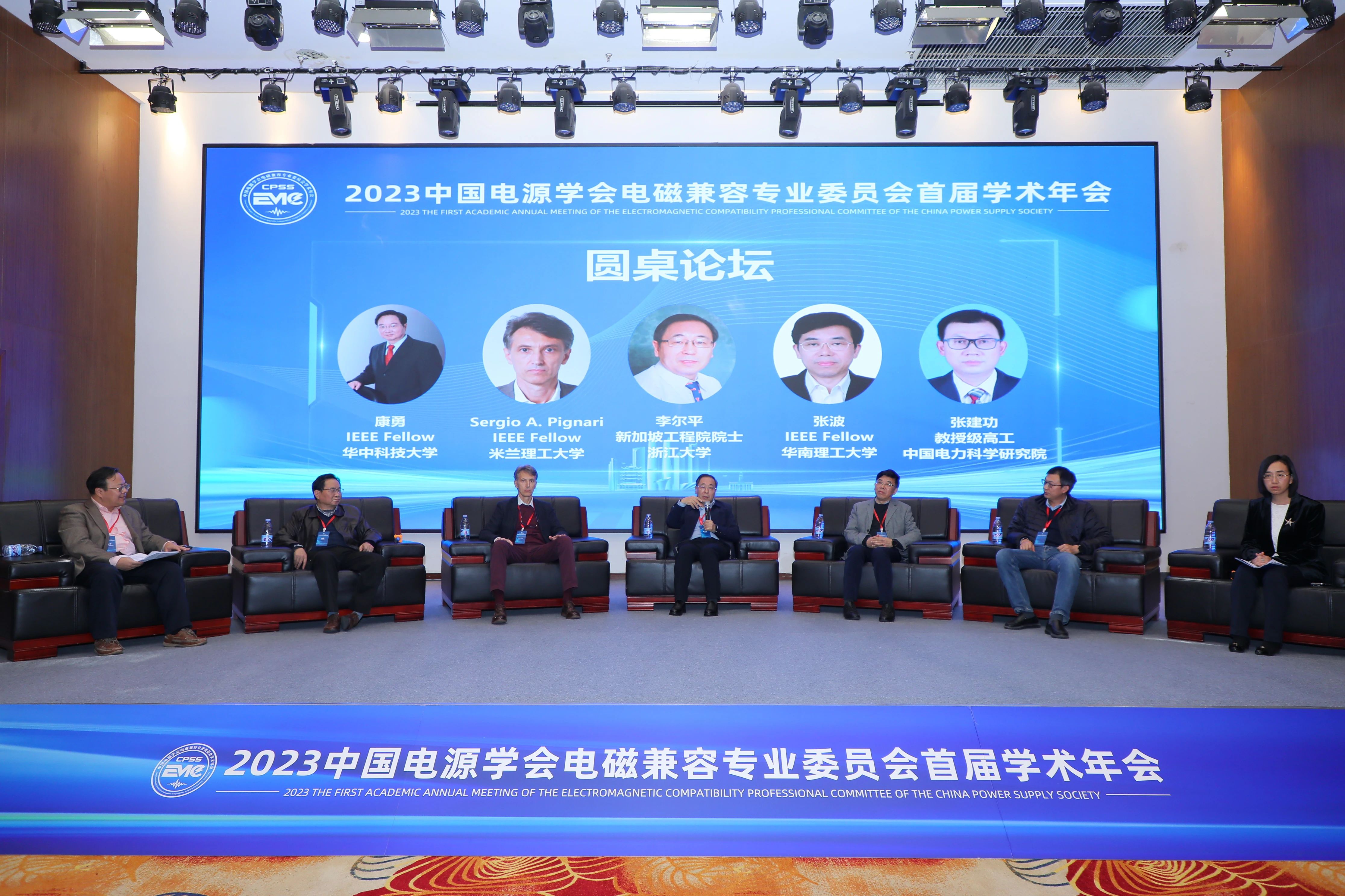圆桌论坛由李虹教授和和军平副教授主持,邀请了浙江大学李尔平教授、米兰理工大学Pignari Sergio Amedeo、华南理工大学张波教授、华中科技大学康勇教授、中国电力科学研究院有限公司武汉分院教授级高级工程师张建功5位专家回顾了电源电磁兼容学术研究的发展历程,探讨了电源电磁兼容领域发展的挑战和机遇。